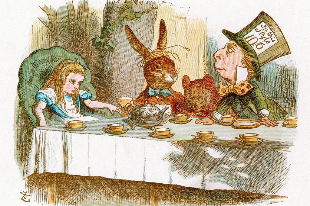 Em 1843, William Rowan Hamilton, buscando estender os números complexos a um número maior de dimensões, introduziu alguns objetos matemáticos que descrevem as rotações em um espaço tridimensional: os quatérnios. Voltando a Alice: na festa do chá do Chapeleiro Maluco, falta um convidado, o Tempo, então eles passam o resto do dia girando e girando. Esta passagem é uma paródia sobre as propriedades dos quatérnios.