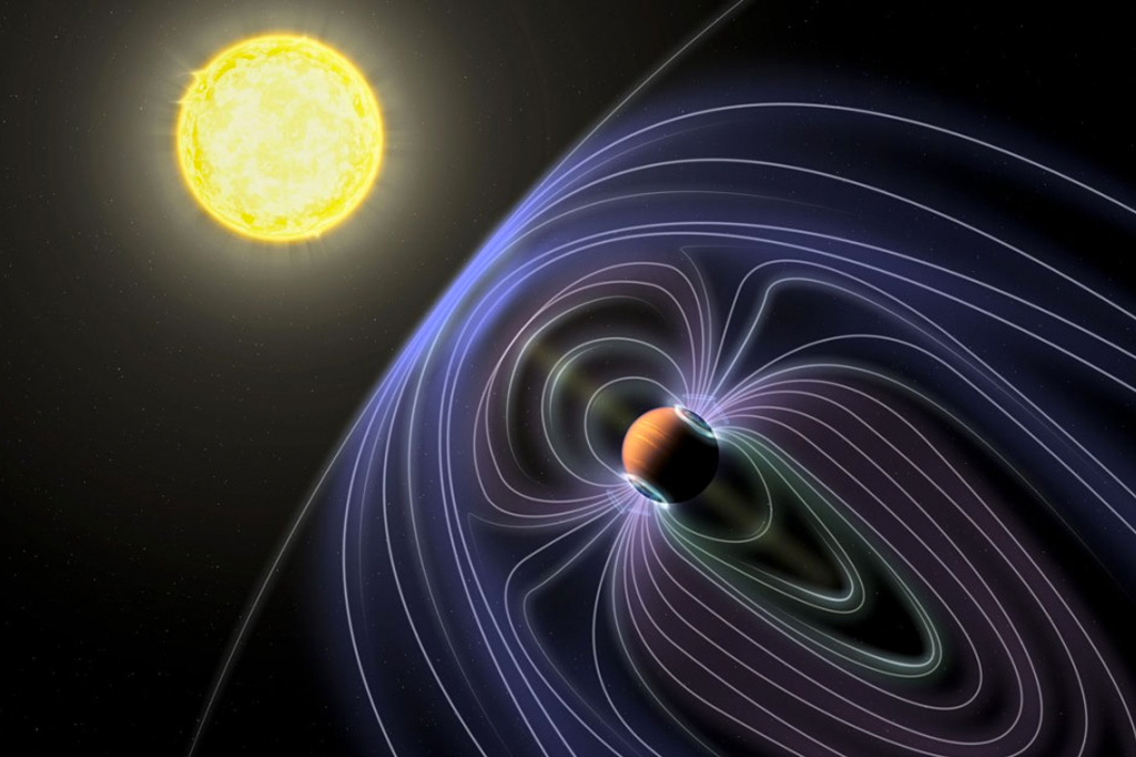 A presença de um campo magnético também é um ponto a favor da habitabilidade do planeta. Ele funciona como um escudo, repelindo ventos solares e raios cósmicos nocivos para a vida na superfície – caso haja vida, é claro. Ele também evita que a atmosfera perca gás demais para o espaço.