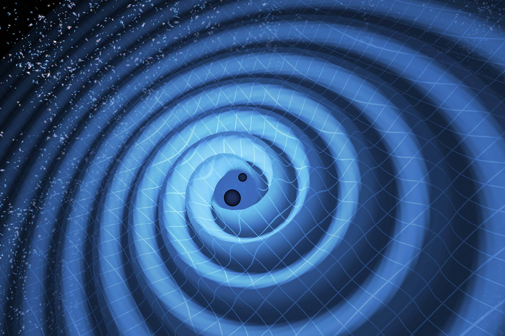 Elas são como abalos sísmicos que se propagam por todo o universo: vibrações no próprio tecido do espaço-tempo. Ao contrário de ondas eletromagnéticas, que são bem fáceis de produzir — é isso que fazem lâmpadas, TVs e estrelas —, ondas gravitacionais só surgem após algo com muita, muita massa aprontar alguma coisa. Como um casal de buracos negros na órbita um do outro. Essa valsa cósmica é quase uma dança do acasalamento, que acaba com a união dos dois em uma outra singularidade, ainda maior. Que filhote!
