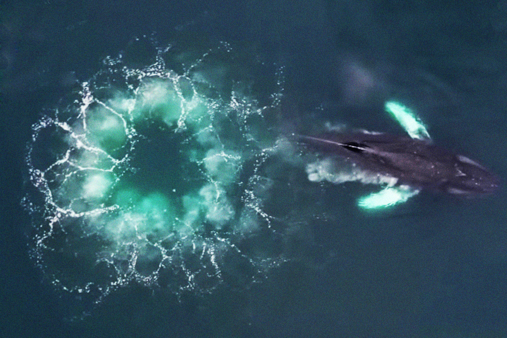 Vídeo inédito flagra jubartes usando “rede de bolhas” para caçar peixes