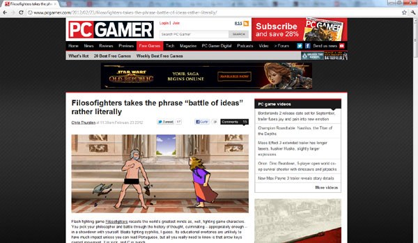 No dia 23 de fevereiro, o Filosofighters ganhou destaque no site da revista PC Gamer. A publicação britânica, que está entre as mais vendidas do mundo no gênero, considerou o jogo uma “surpresa agradável”. O colunista Chris Thurtsen elogia a “batalha de ideias” e diz ter se divertido ao ver Nietzsche usando o golpe “Deus está morto” contra Santo Agostinho.