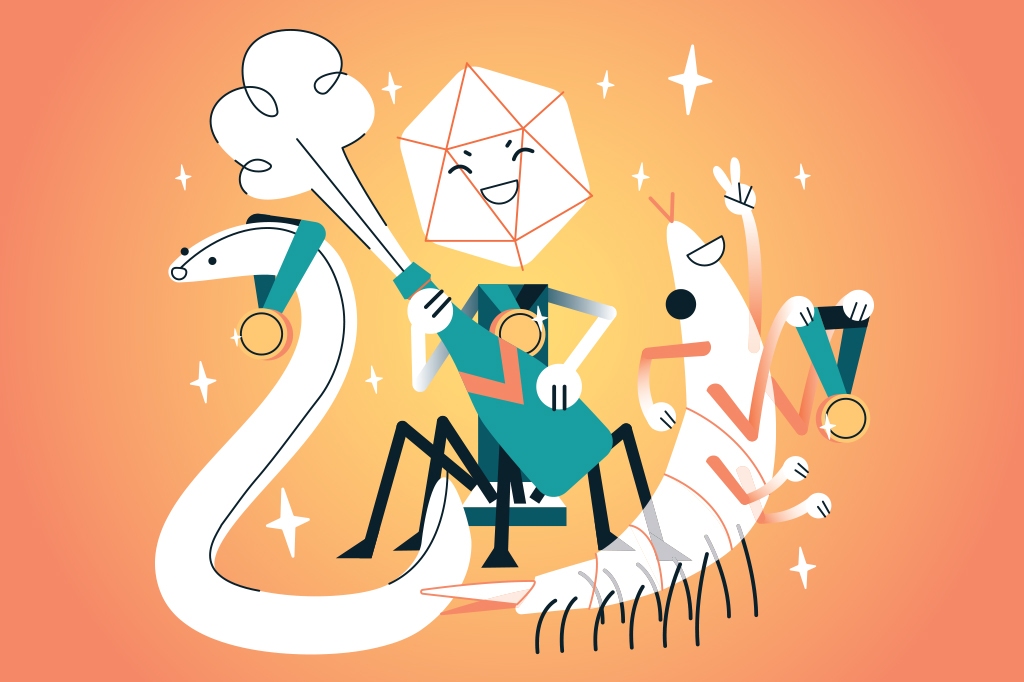 Alguma espécie de bactéria oceânica como a P. ubique, portanto, seria a campeã não fosse um pequeno detalhe (prepare-se para o plot twist): toda bactéria pode ser infectada por vírus bacteriófagos – esses com cabecinha geométrica de icosaedro que você vê na ilustração. Por isso, estima-se que o número total desses vírus nos oceanos seja umas mil vezes maior que o das bactérias, com 30 ou 31 zeros. Eis os campeões do planeta.