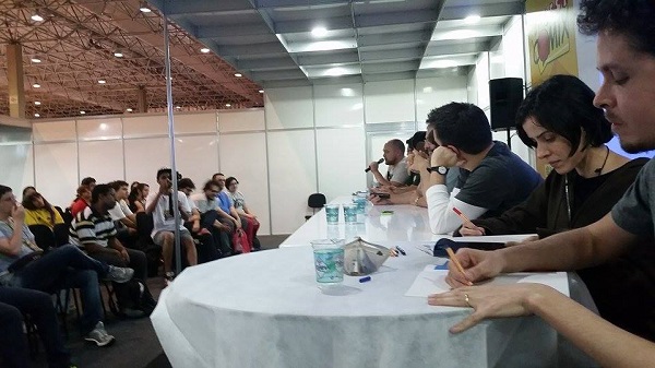 Lu e Vitor Cafaggi (na ponta direita) na mesa sobre a Graphic MSP da Fest Comix