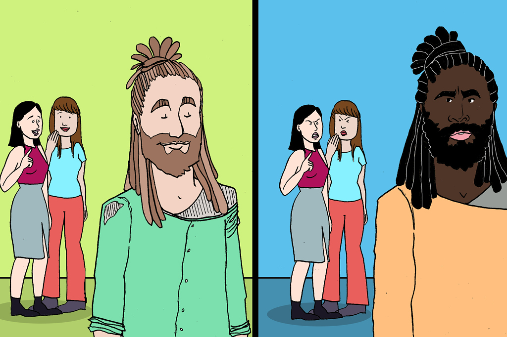 #SuperAcessível: Quadro 1: um rapaz branco e loiro, de barba, dreads e roupa rasgada, está passando na rua. Atrás dele, duas mulheres brancas conversam. Uma das mulheres, que tem cabelos escuros e está usando saia, diz: “Nossa! Que gato”. A outra, de cabelos mais claros e calça comprida, responde, sorrindo: “Bem estilo hippie, né?” Quadro 2: um rapaz negro passa na frente das mesmas mulheres brancas. O cara está com o visual idêntico ao loiro do quadro anterior: dreads, roupa rasgada e barba comprida. A moça de cabelos escuros faz uma cara de horror e diz: “Que cara mais sujo”. A outra, de cabelos claros, responde (com cara de nojo): “Acho que ele está bêbado! Não chega perto”. Nosso conselho nesse caso: Admirar signos da cultura negra apenas em pessoas brancas é sinal de racismo. Afinal, fazer isso é se esquecer que o uso de dreads – assim como o de turbantes e tranças – faz parte da cultura africana e tem significados importantes para pessoas negras. A apropriação cultural destes signos ser vista como algo estiloso, enquanto seu uso por pessoas negras ser visto com preconceito é, além de racista, hipócrita.