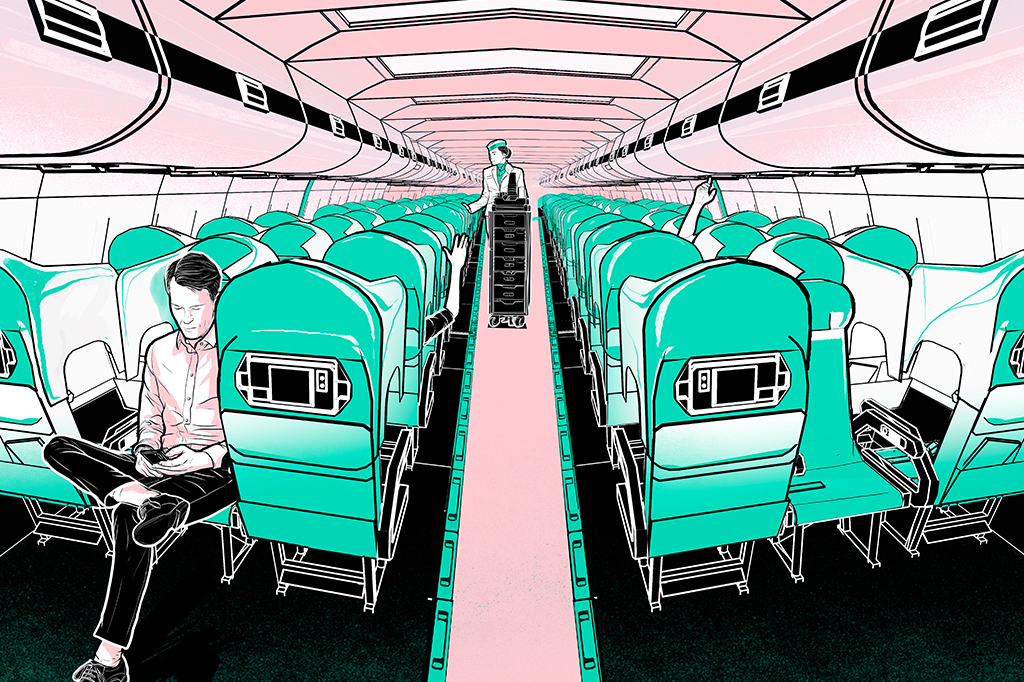 1/4 A empresa italiana AvioInteriors propõe uma mudança nos assentos dos aviões: os passageiros das extremidades olham para frente, enquanto o do meio olha para trás. Essa disposição, em tese, abre espaço para um escudo de proteção. E evita que os passageiros tenham de amputar os braços para embarcar num voo de classe econômica. (Davi Augusto/Superinteressante)