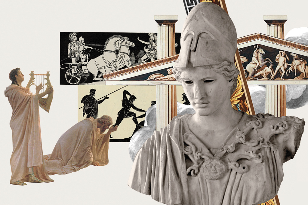 Certo dia, Zeus acordou com uma dor de cabeça brutal. Ele decidiu apelar para uma espécie de cirurgia radical: Hefestos, o deus do fogo e dos metais, abriu-lhe o crânio a golpes de marreta. E foi dos miolos de Zeus que surgiu uma das divindades mais importantes do Olimpo: Atena, a deusa da sabedoria. Era uma figura de beleza estonteante, que vivia sendo cortejada. Mas jamais se entregou.