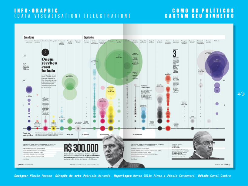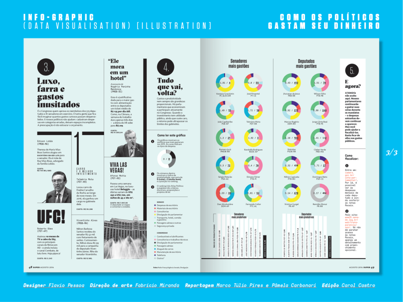 “Como os políticos gastam seu dinheiro”, um infográfico feito pelo designer Flávio Pessoa, pelo jornalista de dados Marco Túlio Pires e as jornalistas Pâmela Carbonari e Carol Castro (não é a atriz), publicado na edição 364, de agosto de 2016.