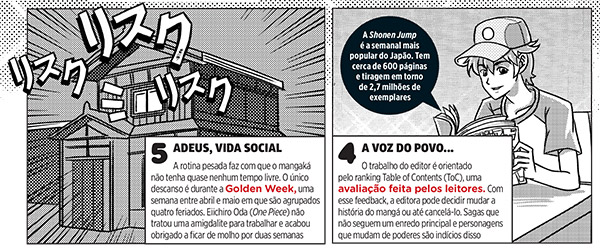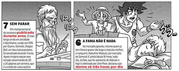 No mercado japonês, mesmo quem já tem fama e grana não larga o osso (ou melhor, o nanquim). Nobuhiro Watsuki, por exemplo, de Samurai X, ainda labuta 16 horas, todo dia. Já Oda, que foi assistente de Watsuki e hoje é celebrado por One Piece, declarou que dorme só três horas por dia