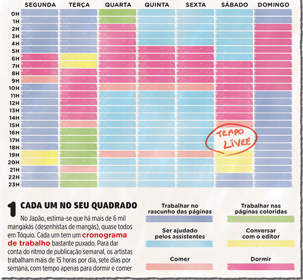 No Japão, estima-se que há mais de 6 mil mangakás (desenhistas de mangás), quase todos em Tóquio. Cada um tem um cronograma de trabalho bastante puxado. Para dar conta do ritmo de publicação semanal, os artistas trabalham mais de 15 horas por dia, sete dias por semana, com tempo apenas para dormir e comer