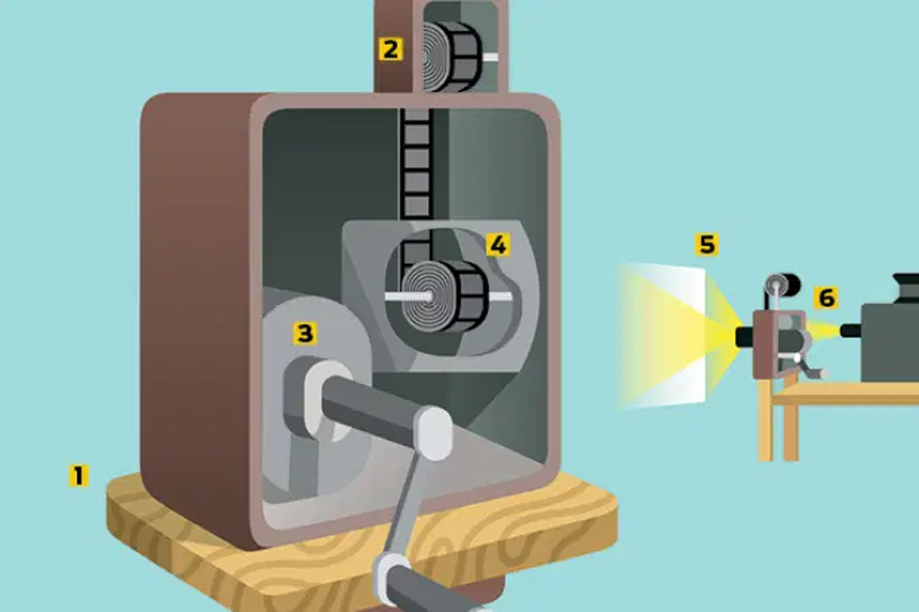 6. O filme revelado era devolvido à caixinha superior. A lente de pouca abertura usada para a gravação era trocada por uma maior, que ampliava as imagens. Uma fonte de luz, posicionada atrás da máquina aberta, enviava as imagens para a tela branca. Aí, bastava rodar a mesma manivela no mesmo ritmo do registro.