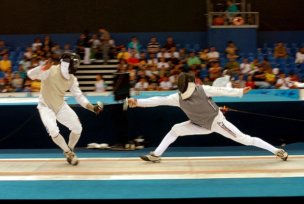 A ponta da arma tem um sensor. E ele faz uma lâmpada acender a cada golpe certeiro. O número de vezes que a luz ligou fica registrado. Aí fica fácil de ver quem ganhou. Normalmente, um fio liga o atleta à lâmpada. Mas ele vem sendo substituído por transmissores, tipo controle remoto, para dar mais mobilidade. Há três armas nesse esporte: espada, florete e sabre. Com o florete, a mais leve delas, só vale quando a ponta atinge o tronco. Com a espada, que tem a lâmina mais rígida, você pode tocar o adversário em qualquer parte do corpo. Já o sabre simula uma lâmina de corte. Ou seja: valem golpes com qualquer parte da arma. E pode acertar a cabeça e os braços. Nessa modalidade os sensores não ficam na ponta da arma, só no uniforme.