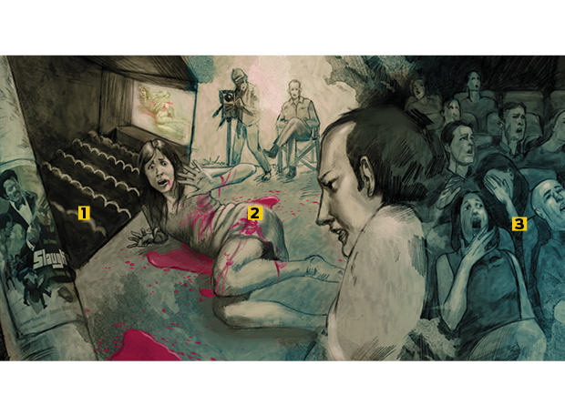 2. O empresário então teve a ideia de rodar um novo final, mostrando a “equipe do filme” supostamente mutilando a atriz principal. Quando a crueldade está quase acabando, a câmera “fica sem filme”, e restam apenas vozes em pânico das vítimas e alguém perguntando se tudo havia sido filmado