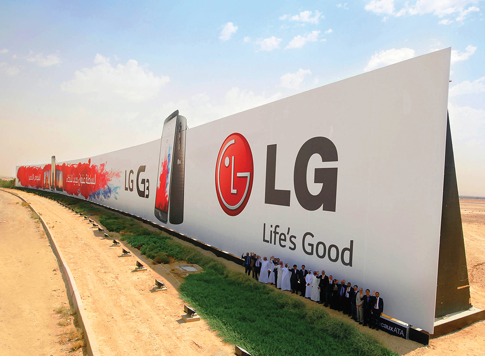 A peça exibe um anúncio do celular G3 da fabricante de eletrônicos sul-coreana LG e foi projetada para resistir aos fortes ventos do deserto saudita. O gigantismo do outdoor, que pesa 1.800 toneladas, foi reconhecido pelo Guinness, o livro dos recordes, em setembro de 2014.