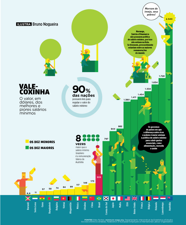 Fontes Sites Forbes, minimum-wage.org, Departamento Intersindical de Estatística e Estudos Socioeconômicos (Dieese), Federation of European Employers e International Labour Organization