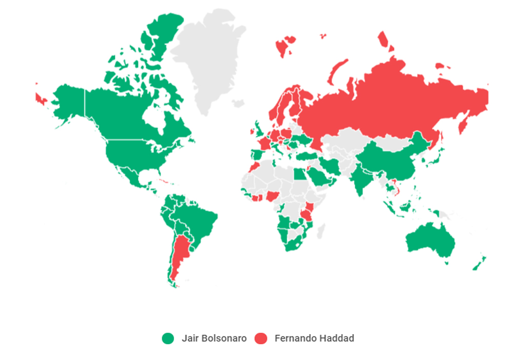 Por volta das 19:40 deste domingo, 28, o Tribunal Superior Eleitoral (TSE) cravou o resultado: o então deputado, Jair Messias Bolsonaro, havia sido eleito o novo presidente da república ao receber 55% dos mais de 105 milhões de votos válidos deste segundo turno. Com votos vindos principalmente das regiões Sul, e Sudeste, o candidato conseguiu derrotar o candidato do PT, Fernando Haddad. Mas os votos para Bolsonaro não vieram só de cidades da parte de baixo do país. Na verdade, não vieram nem mesmo só do nosso país. Ele também teve uma ajudinha de lugares como Estados Unidos, Inglaterra e até Bolívia. Haddad também não ficou órfão em terras estrangeiras. O candidato foi o mais votado na Alemanha e Cuba, por exemplo.