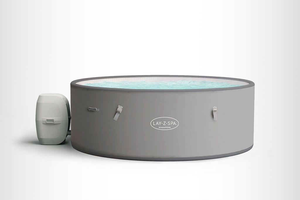 A banheira Singapore Airjet Plus (US$ 730), da marca Lay-Z-Spa, é inflável: basta colocá-la no quintal (ou no banheiro, se ele tiver espaço suficiente) e ligar o compressor que vem junto.